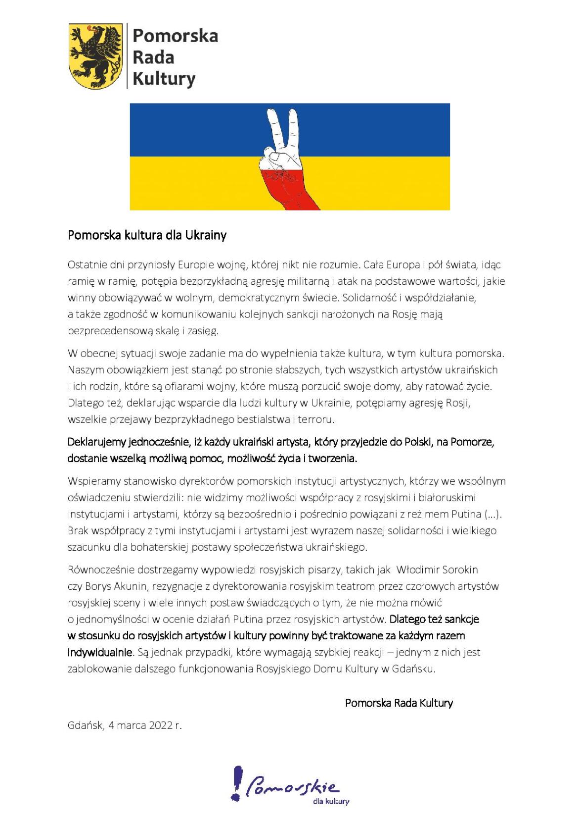 Pomorska kultura dla Ukrainy: oświadczenie Pomorskiej Rady Kultury z dnia 4 marca 2022 wAktualności Pomorska Rada Kultury m.in. o wojnie, sankcjach dla rosyjskich artystów i zablokowaniu funkcjonowania Rosyjskiego Domu Kultury w Gdańsku.