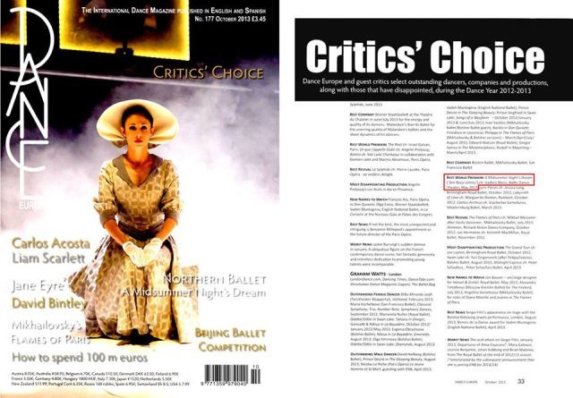 Graham Watts w magazynie „Dance Europe” jako najlepszą na świecie premierę taneczną sezonu 2012/13 wskazał Sen nocy letniej Bałtyckiego Teatru Tańca.
