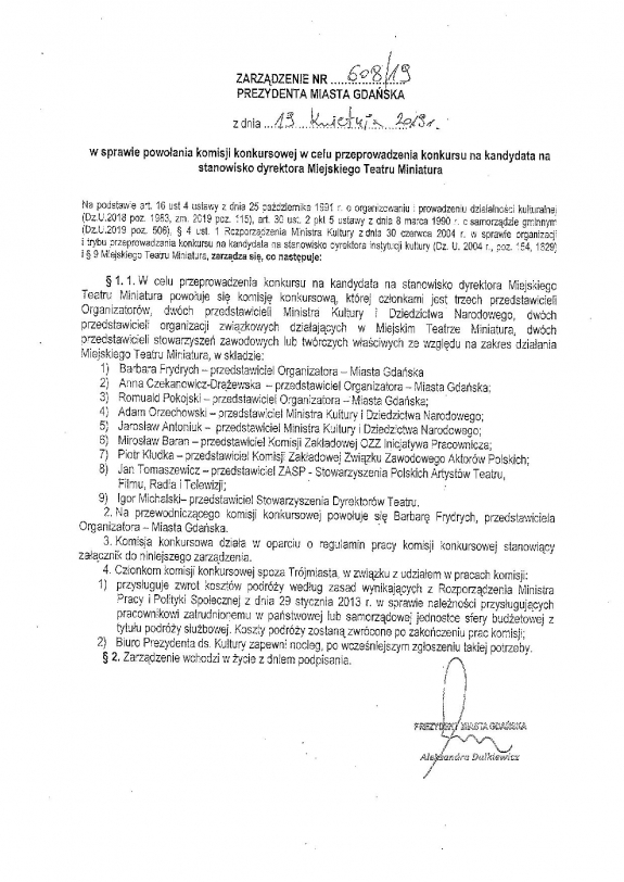 Trójkę Organizatorów – Miasto Gdańsk, reprezentują: Barbara Frydrych (szefowa Biura Kultury), Anna Czekanowicz-Drążewska(b. szefowa Biura Kultury, b. doradczyni Pawła Adamowicza), Romuald Pokojski (dyrektor Teatru Miniatura, p.o. dyrektora Opery Bałtyckiej). Dwóch przedstawicieli Ministerstwa Kultury i Dziedzictwa Narodowego to: Jarosław Antoniuk (dyrektor Teatru Lalki i Aktora w Łomży) i Adam Orzechowski(dyrektor Teatru Wybrzeże). Dwóch związkowców i zarazem przedstawicieli załogi to: Piotr Kłudka(Komisja Zakładowa Związku Zawodowego Aktorów Polskich) oraz Mirosław Baran (Komitet Zakładowy OZZ Inicjatywa Pracownicza). Przedstawicielem ZASP-u jest Jan Tomaszewicz a Stowarzyszenia Dyrektorów Teatrów – Igor Michalski (dyrektor Teatru Muzycznego im. Danuty Baduszkowej w Gdyni).