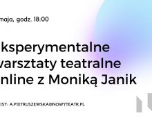 AktualnościEdukacjaNowy Teatr 13.05 Eksperymentalne warsztaty teatralne online z Moniką Janik z dnia 10 maja 2020 Termin: 13.05.2020, godz. 18.00 Wszystkich stęsknionych za teatrem zapraszamy na... Czytaj dalej