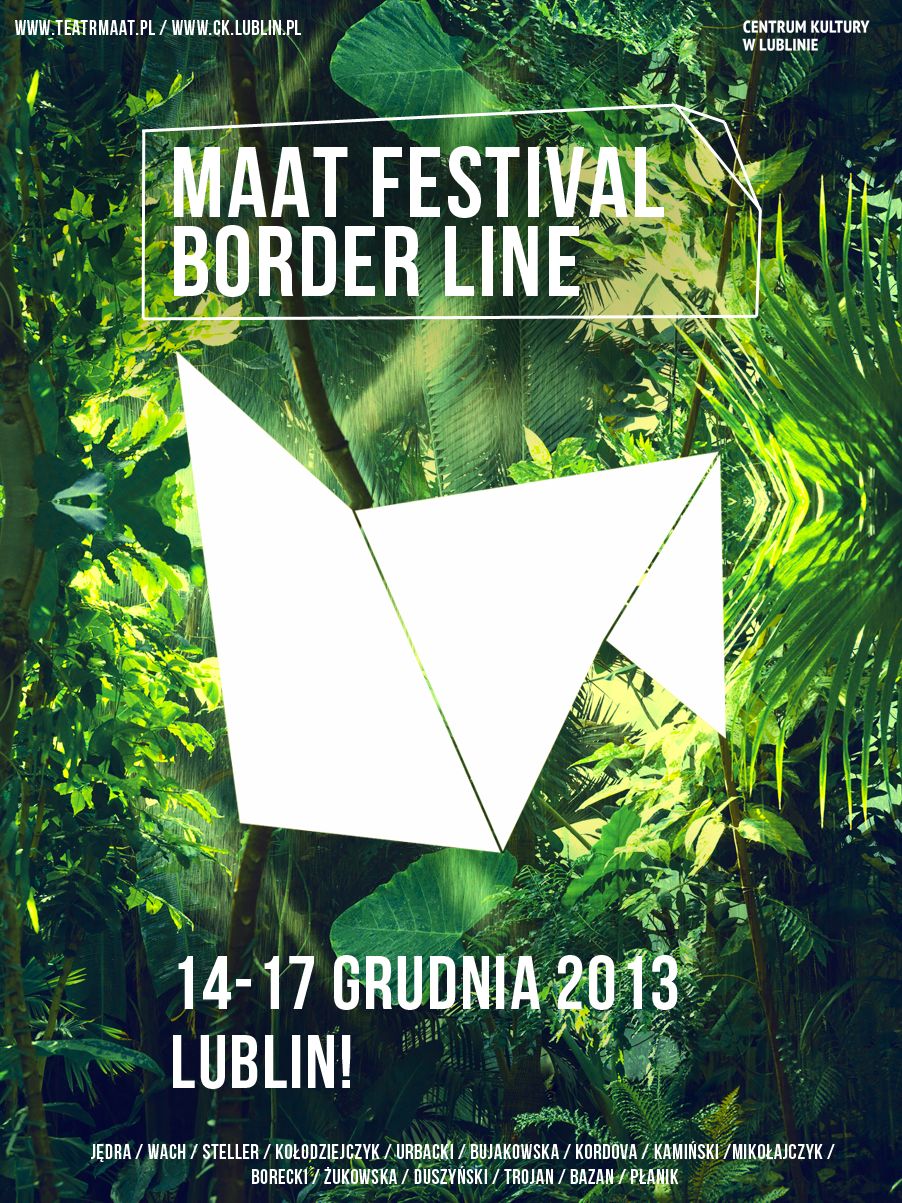 V MAAT FESTIVAL ‚border – line 2013 idea, koncept: Tomasz Bazan (kurator programu) / multimedia/video: Patrycja Płanik / produkcja: Maria Sapeta / technika: Maciej Połynko, Karol Rębisz / współpraca: Barbara Szymańska, Małgorzata Drozd, Maciej Rukasz, Dominika Płanik, Matylda Chmielewska, Małgorzata Bartkiewicz, Ksenia Duńska / program kuratorski Tomasza Bazana ‘Maat Festival’ zrealizowany ze środków Centrum Kultury w Lublinie oraz Teatru Maat Projekt – pod honorowym patronatem PREZYDENTA MIASTA LUBLIN, MARSZAŁKA WOJEWÓDZTWA LUBELSKIEGO oraz pod patronatem medialnym portalu TANIECPOLSKA.PL , E-TEATR / wspierają nas: CAFFE SPÓŁDZIELNIA Lublin, Hotel VICTORIA Lublin, caffe KAWKA Lublin, DOM ŻOŁNIERZA Lublin