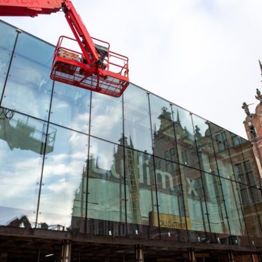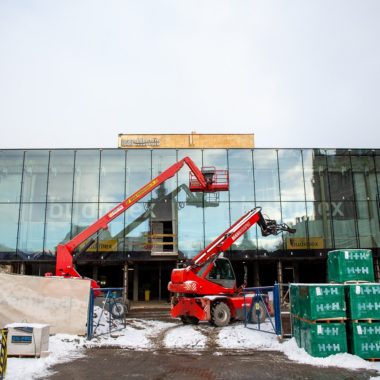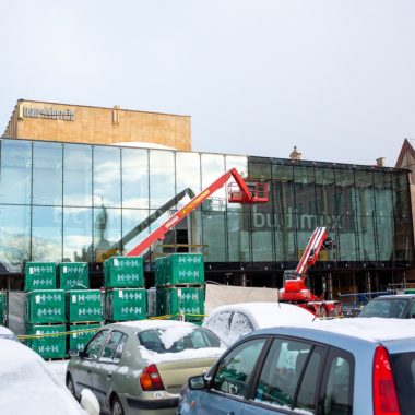 Obecnie trwa montaż frontowej fasady szklanej. Zapraszamy Państwa do obejrzenia galerii zdjęć z tego etapu przebudowy.
