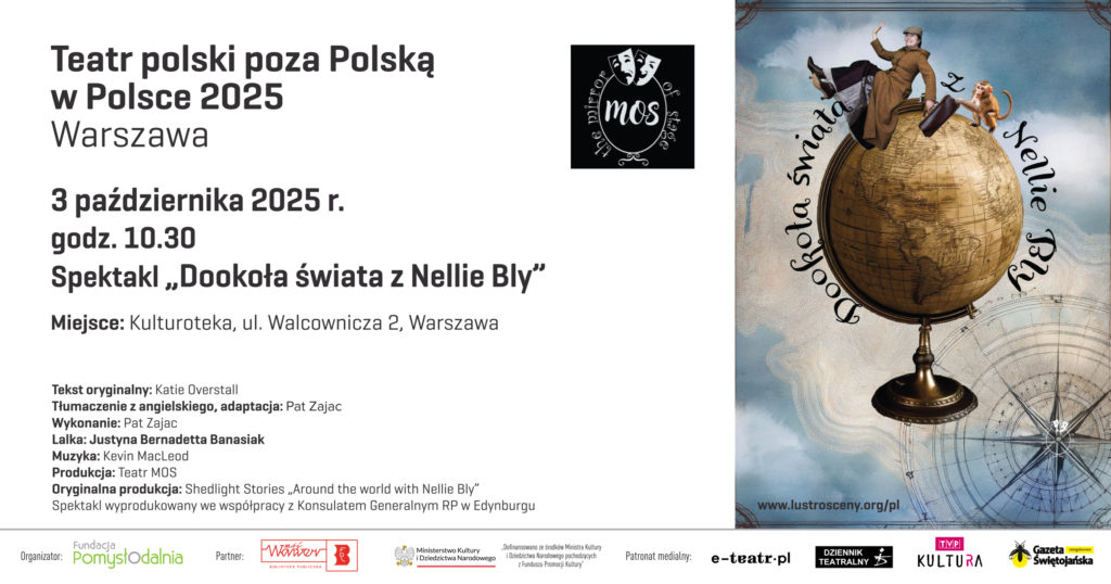 Autorska sztuka Katie Overstall Around the world with Nellie Bly przetłumaczona i zaadaptowana przez aktorkę Pat Zajac. Oparta w 100% na faktach historia Elizabeth Cochrane Seaman, szerzej znanej jako Nellie Bly, skupia się wokół słynnej wyprawy z 1889 roku, kiedy to reporterka wyruszyła w swój wyścig dookoła świata, stając się pierwszą kobietą, która okrążyła glob, a jednocześnie pobiła „rekord” ustanowiony przez Phileasa Fogga, bohatera powieści Juliusza Verne’a W 80 dni dookoła świata. Niesamowita i mało znana historia pionierki Nellie Bly – amerykańskiej dziennikarki prekursorki dziennikarstwa śledczego i czynnej aktywistki na polu praw kobiet na przełomie XIX i XX wieku w Nowym Yorku, ożywa w spektaklu, który łączy elementy teatru lalkowego oraz interakcję z publicznością, aby inspirować widzów w każdym wieku.