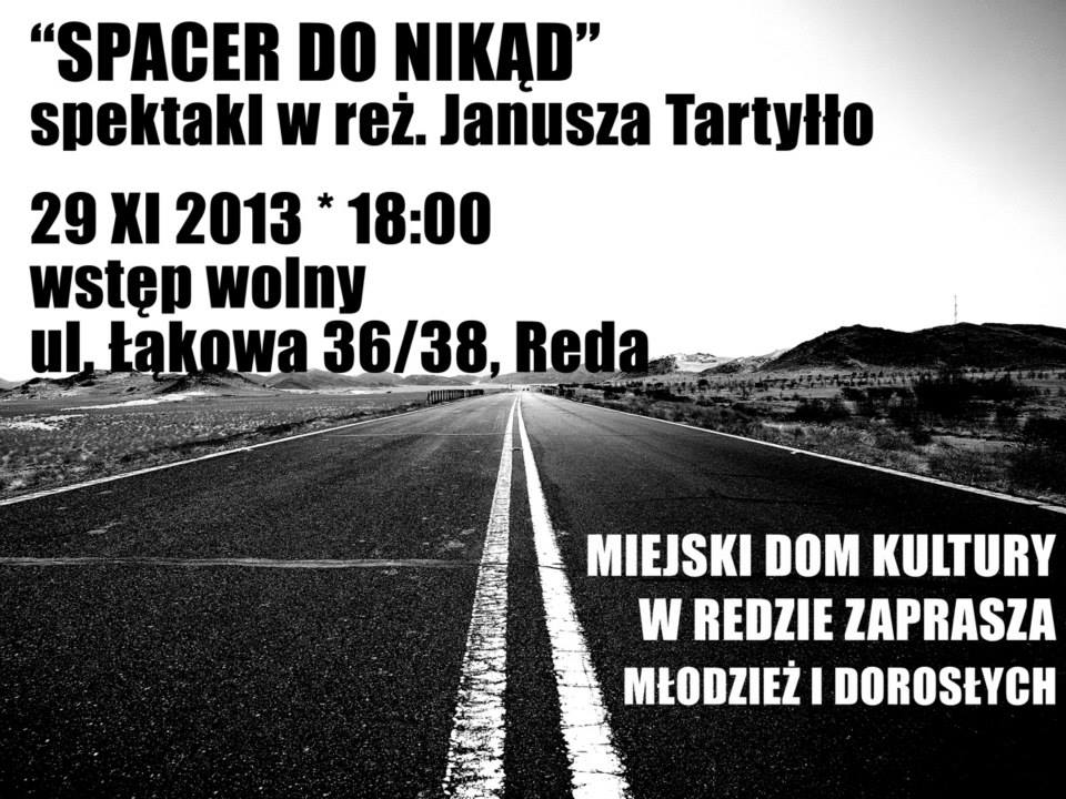 Miejski Dom Kultury w Redzie zaprasza na przedstawienie teatralne w jednym akcie – pisane wierszem – „Spacer do nikąd” w reż. Janusza Tartyłło. Spektakl dla młodzieży i dorosłych.